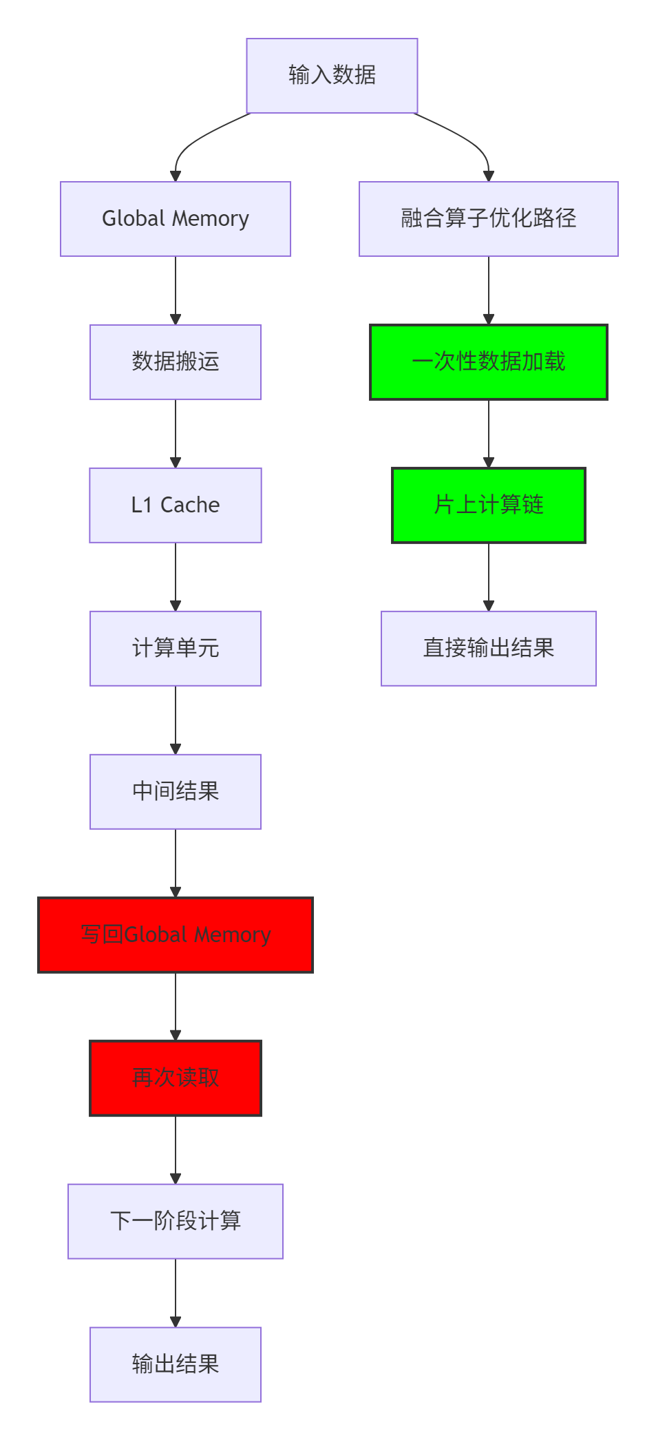 融合算子的核心价值在于优化数据流动路径,减少不必要的全局内存访问