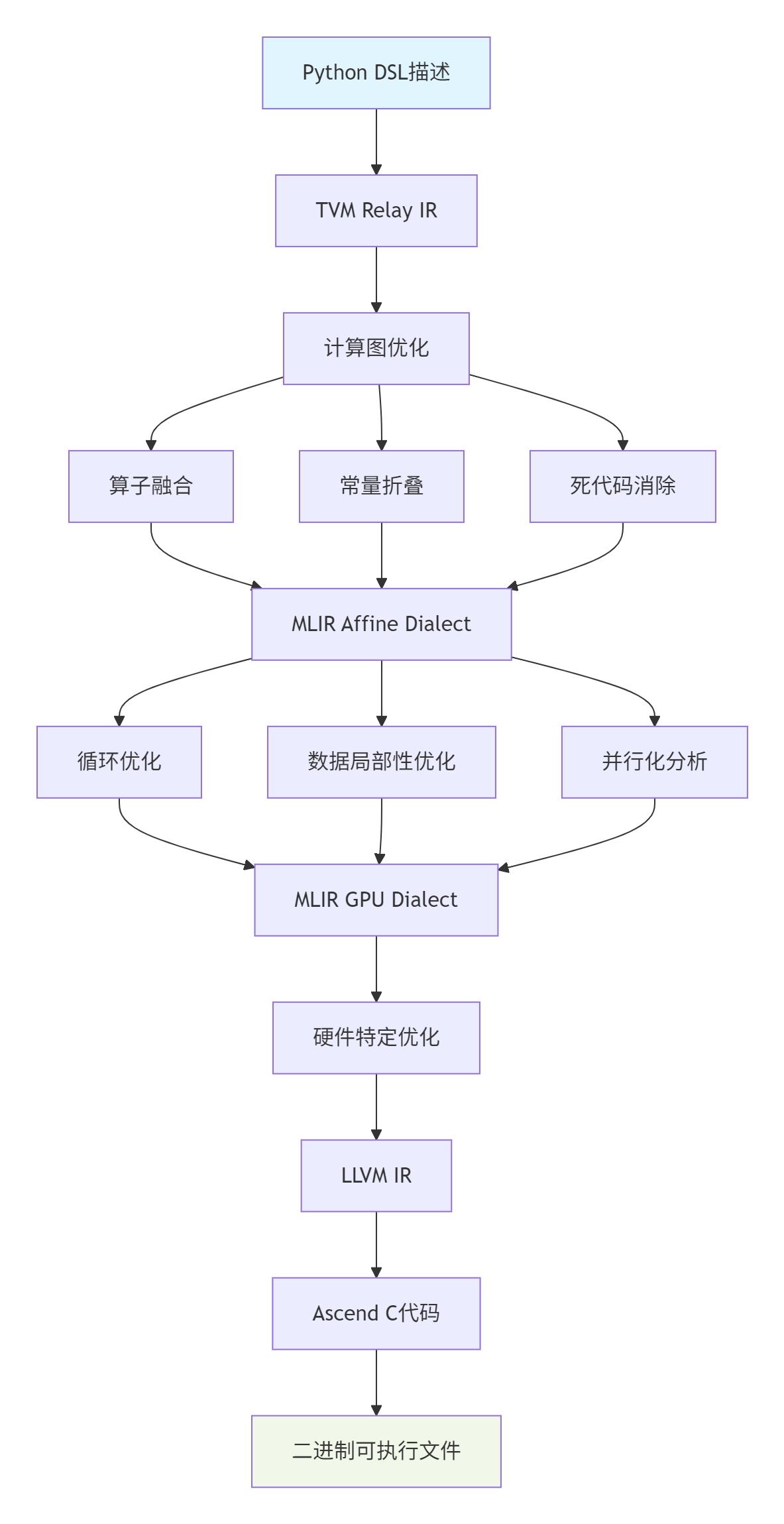 TVM和MLIR构成了Python DSL到Ascend C代码的编译基础。下图展示了从高级描述到硬件代码的完整转换流程: