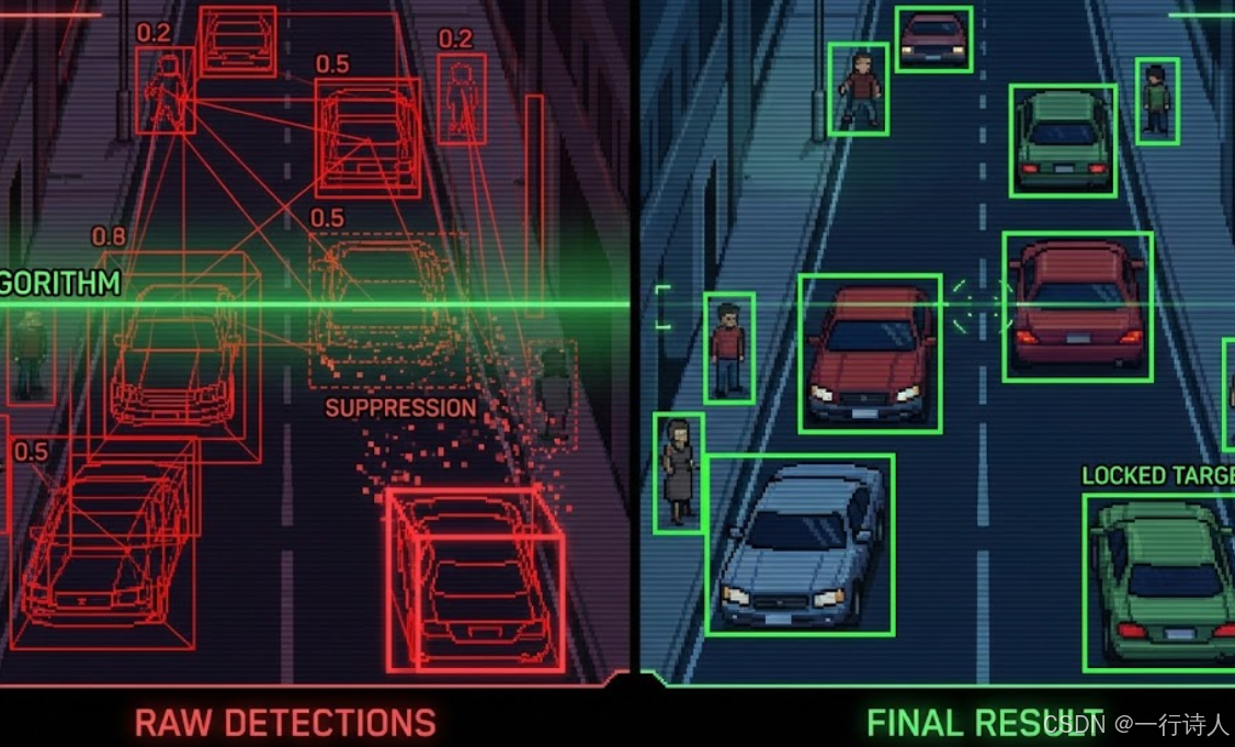 在 YOLO、SSD、Faster R-CNN 等检测网络中,NMS 是最后一道关卡。 它的算法逻辑非常“贪心”: