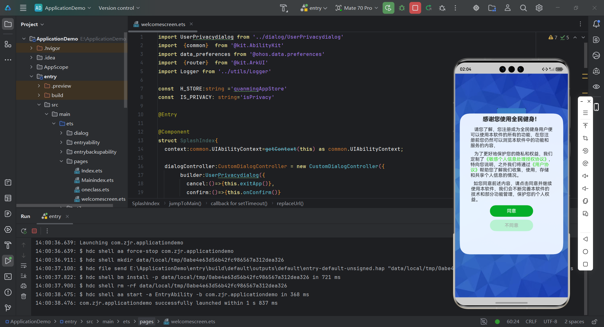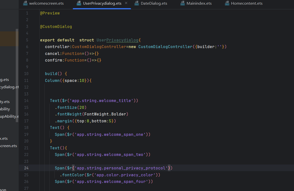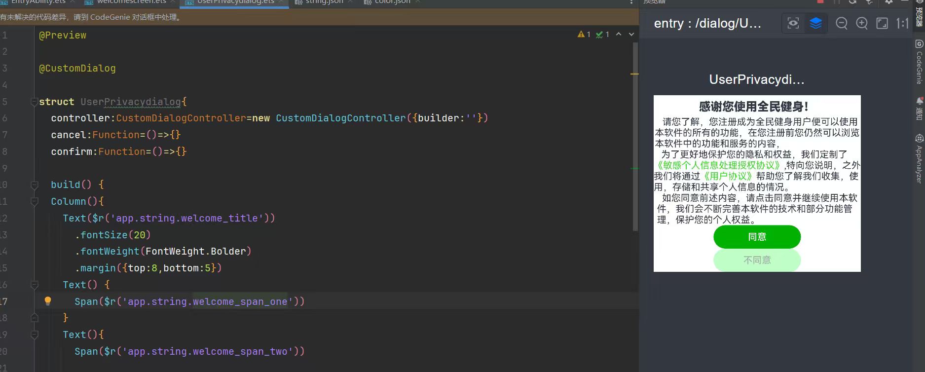 可以新建一个项目命名userprivacydialog(方便在首页welcomescreen中通过import -from调用)(建议userprivacydialog放在dialog文件夹中)