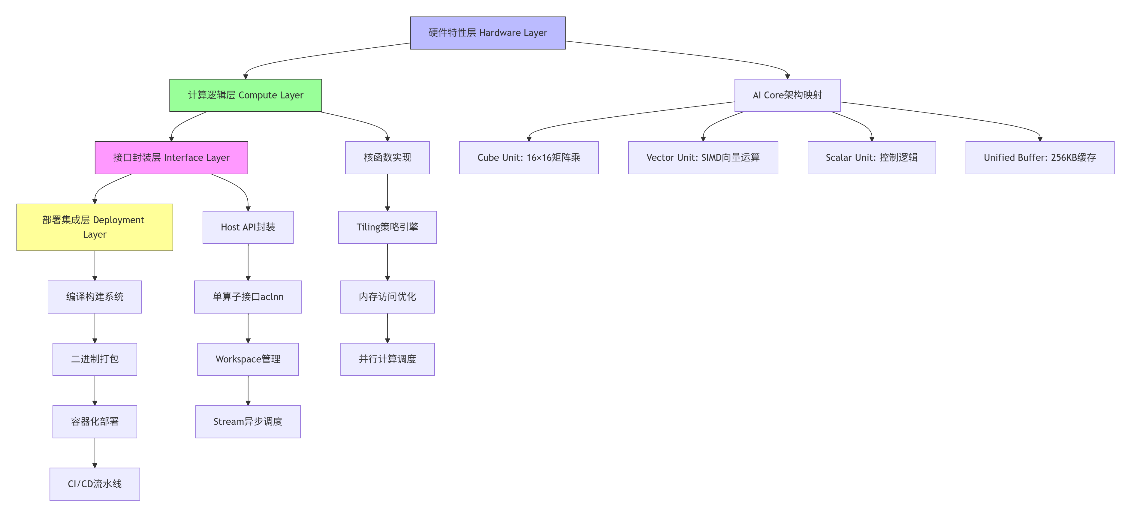 昇腾算子工程项目采用独特的四层架构,将硬件特性、计算逻辑、接口封装和部署集成解耦,这种设计源于对AI算子工程化特殊性的深刻理解。