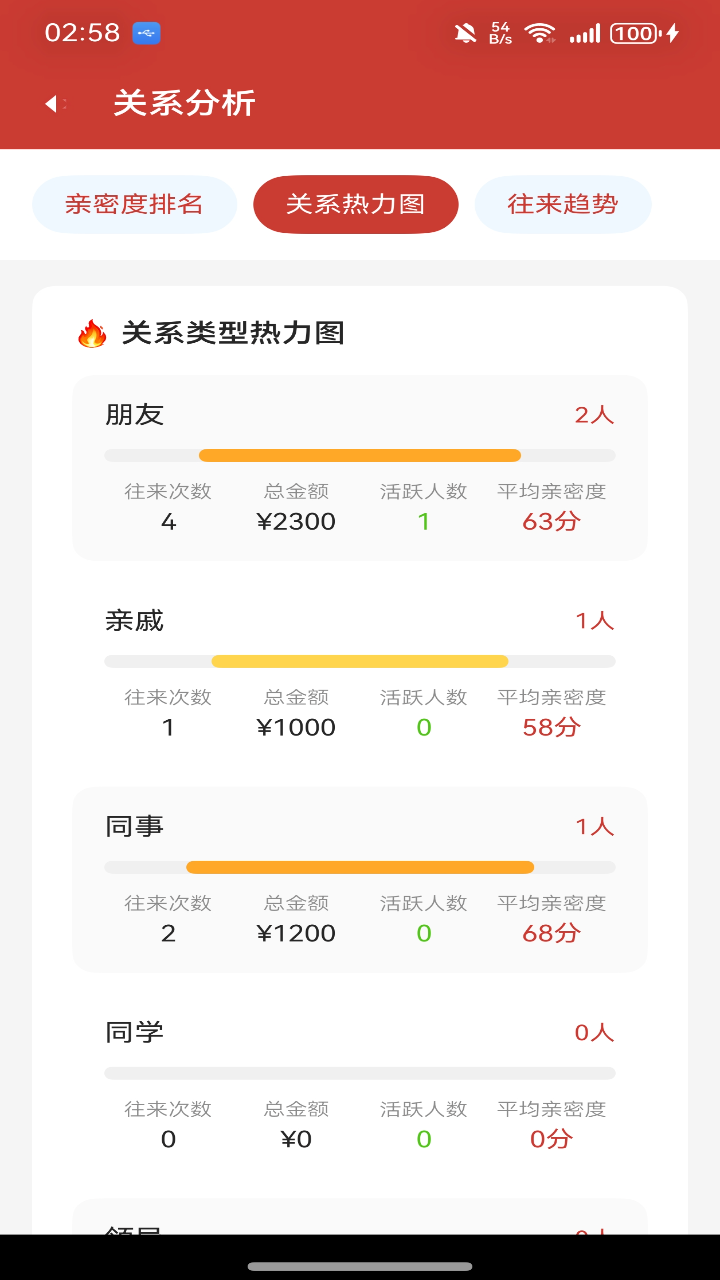 - 关系网络统计:分析不同关系圈的人情往来频率与规模