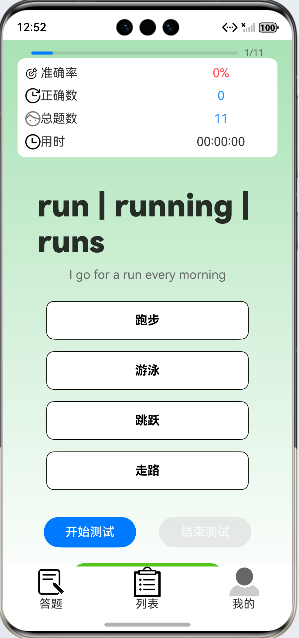 - 答题页(answerPage):纵向布局,依次显示进度、统计、题目、选项和控制按钮