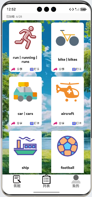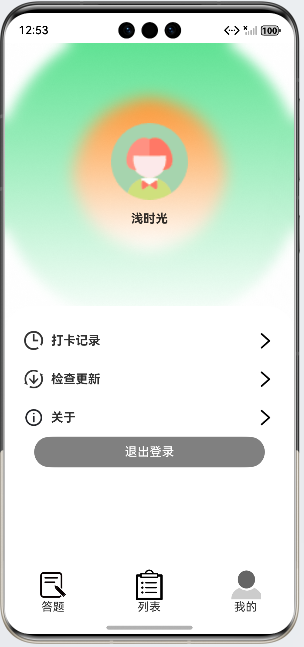 首先进入单词测试APP进入到登录页面,在登录注册页面使用text,textinput,button组件和column等布局实现了页面的渲染。当选择后会给出结果效果错误是红色框,正确是绿色框。实现了下拉刷新(列表随机刷新数据)功能,顶部记录单词卡片加载数,从上往下翻会逐渐加载单词卡片,点击卡片也会跳转到单词测试页面进行测试。最后是我的页面包括头像,昵称,打卡记录页,检查更新页,关于页和退出登录按钮。