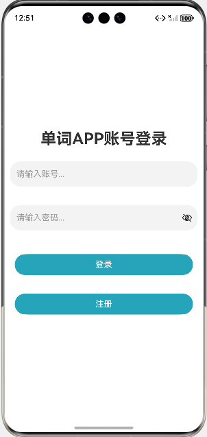 首先进入单词测试APP进入到登录页面,在登录注册页面使用text,textinput,button组件和column等布局实现了页面的渲染。登录注册首页鸿蒙首选项数据存储来实现注册对账户密码的存储。实现了首选项的增改查功能。在输入账户或密码时实现了表单验证功能,如:输入不能为空、密码错误等提示。当用户正确输入账户密码后进入以Tabs组件为基础搭建的底部栏为答题、列表、我的index页面,首先默认显示答题页面。答题页面顶部是答题状态部分,中间是单词选择部分,底部是按钮操控和结果部分。顶部答题状态部分,当开始测试是进度条会根据答题随时跟进,还包括准确率、正确数、总题数、用时功能。中间答题部分是英语单词和对应四个选项答案组成,根据单词选择对应答案。当选择后会给出结果效果错误是红色框,正确是绿色框。无论正确错误3秒后自动刷新到下一个单词的答题。底部控制按钮可以控制开始测试,结束测试,重新测试功能。测试结束后在控制按钮底部会总结答题情况并记录到我的页的打卡记录里。列表页面是多行2列的可滑动列表。实现了下拉刷新(列表随机刷新数据)功能,顶部记录单词卡片加载数,从上往下翻会逐渐加载单词卡片,点击卡片也会跳转到单词测试页面进行测试。最后是我的页面包括头像,昵称,打卡记录页,检查更新页,关于页和退出登录按钮。