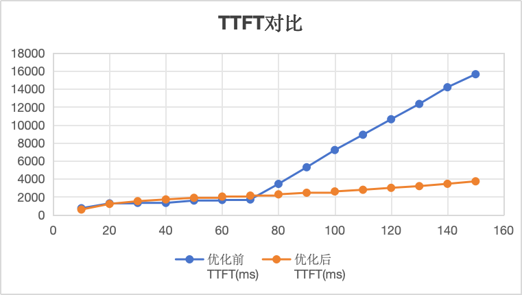 TTFT对比:优化后,并发10-150时,TTFT耗时在4s以内,并缓慢增长。