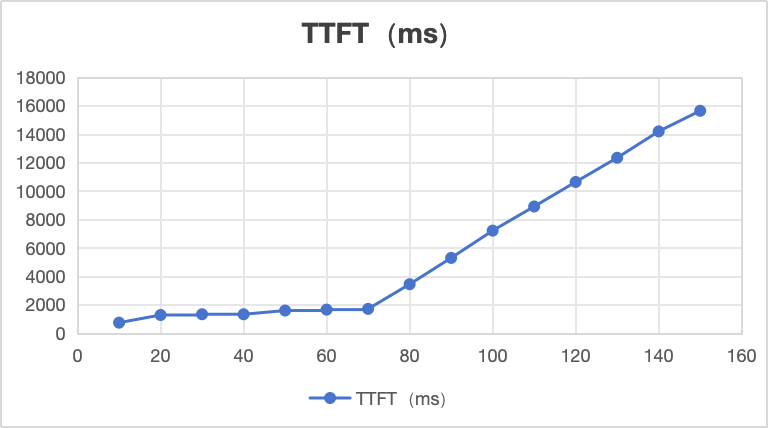 从上图看,并发到70时,TTFT在2s以内为正常,并发70到150之间,TTFT为线性增长