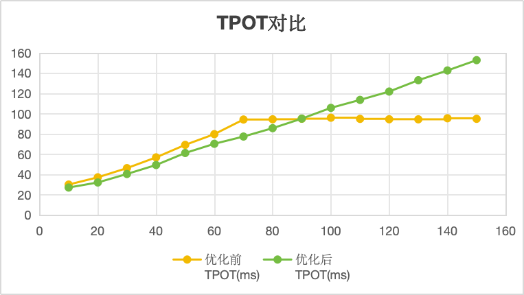 TPOT对比:优化后,并发10-150是,TPOT耗时为线性增长,瓶颈消失。
