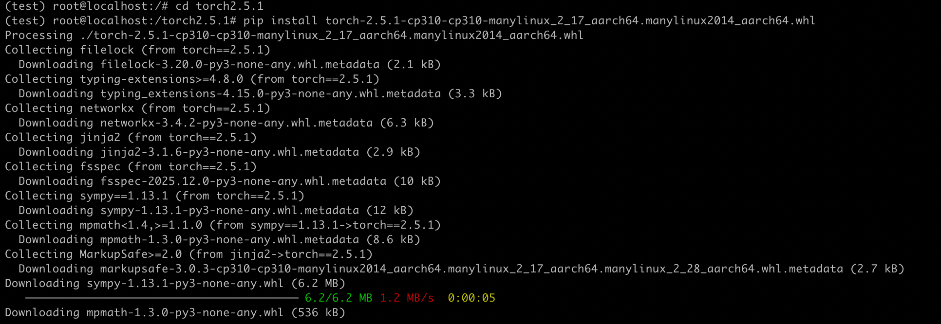Successfully installed MarkupSafe-3.0.3 filelock-3.20.0 fsspec-2025.12.0 jinja2-3.1.6 mpmath-1.3.0 networkx-3.4.2 sympy-1.13.1 torch-2.5.1 typing-extensions-4.15.0,说明 PyTorch 核心包安装完成。