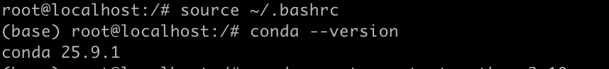原因是当前 shell 未加载/root/.bashrc中新增的 Conda 环境变量,执行以下命令手动加载: