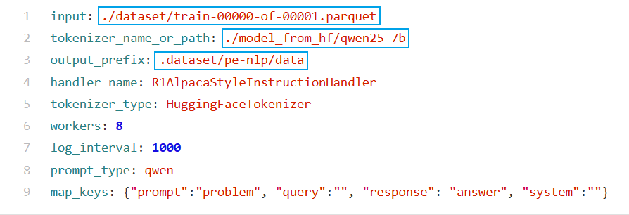 修改配置文件configs/datasets/grpo_pe_nlp.yaml,主要改三个路径:
