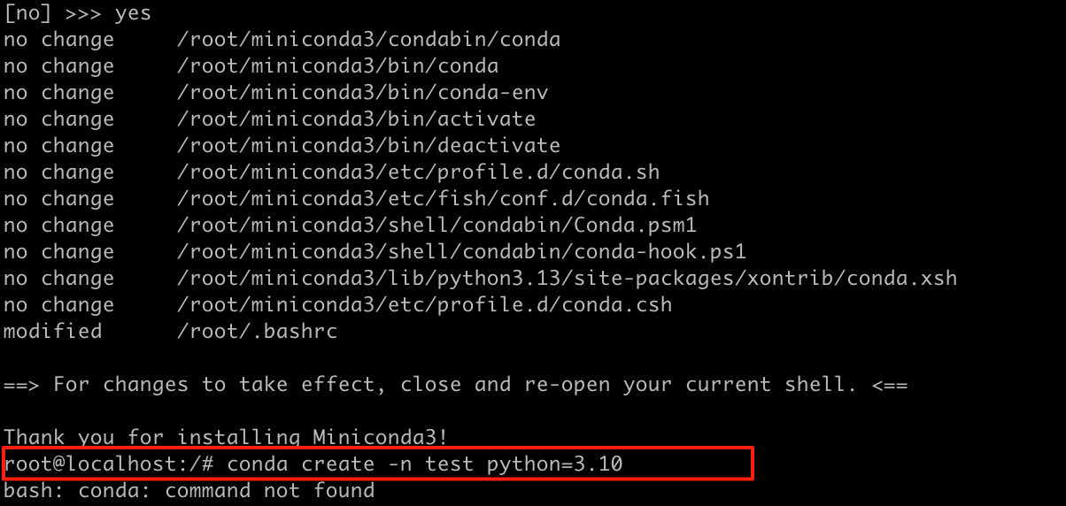yes让 Conda 自动配置环境变量; - 终端提示 “> For changes to take effect, close and re-open your current shell. <”,说明 Miniconda 安装完成。