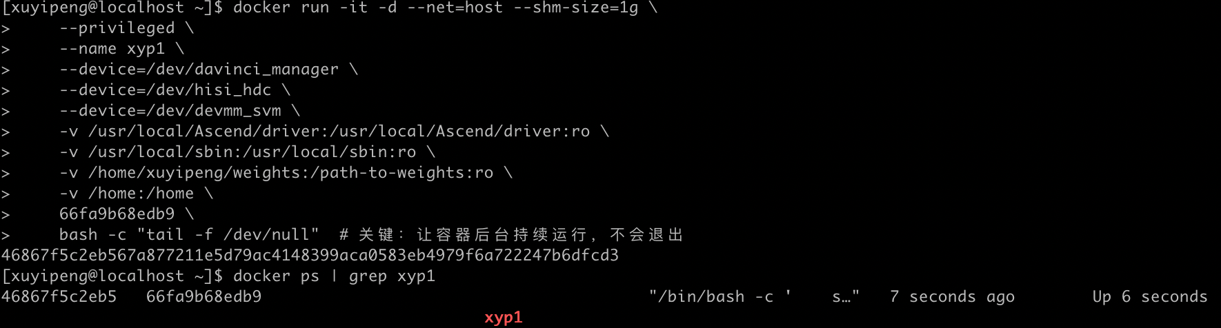 创建成功后,执行docker ps | grep xyp1验证,终端显示容器状态为Up,说明容器已稳定运行。