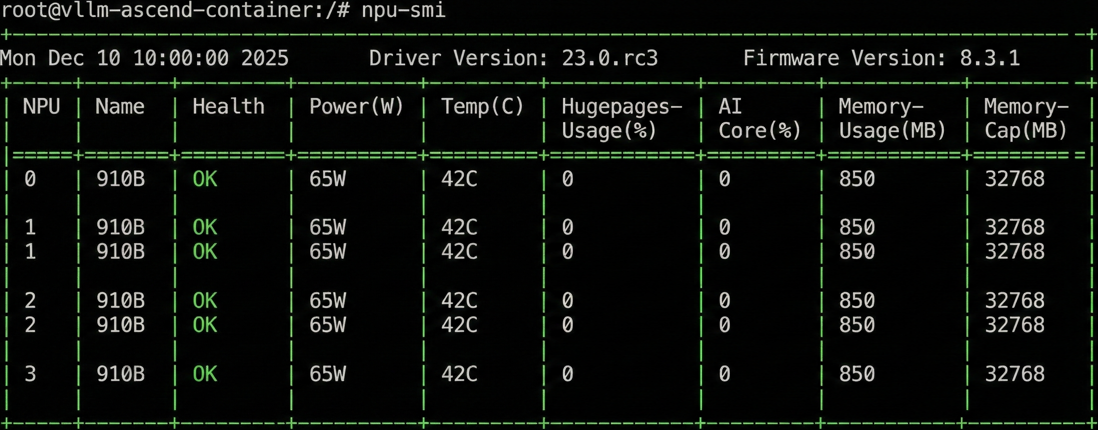 运行后,进容器检查npu-smi,确保NPU识别正常。截图如下: