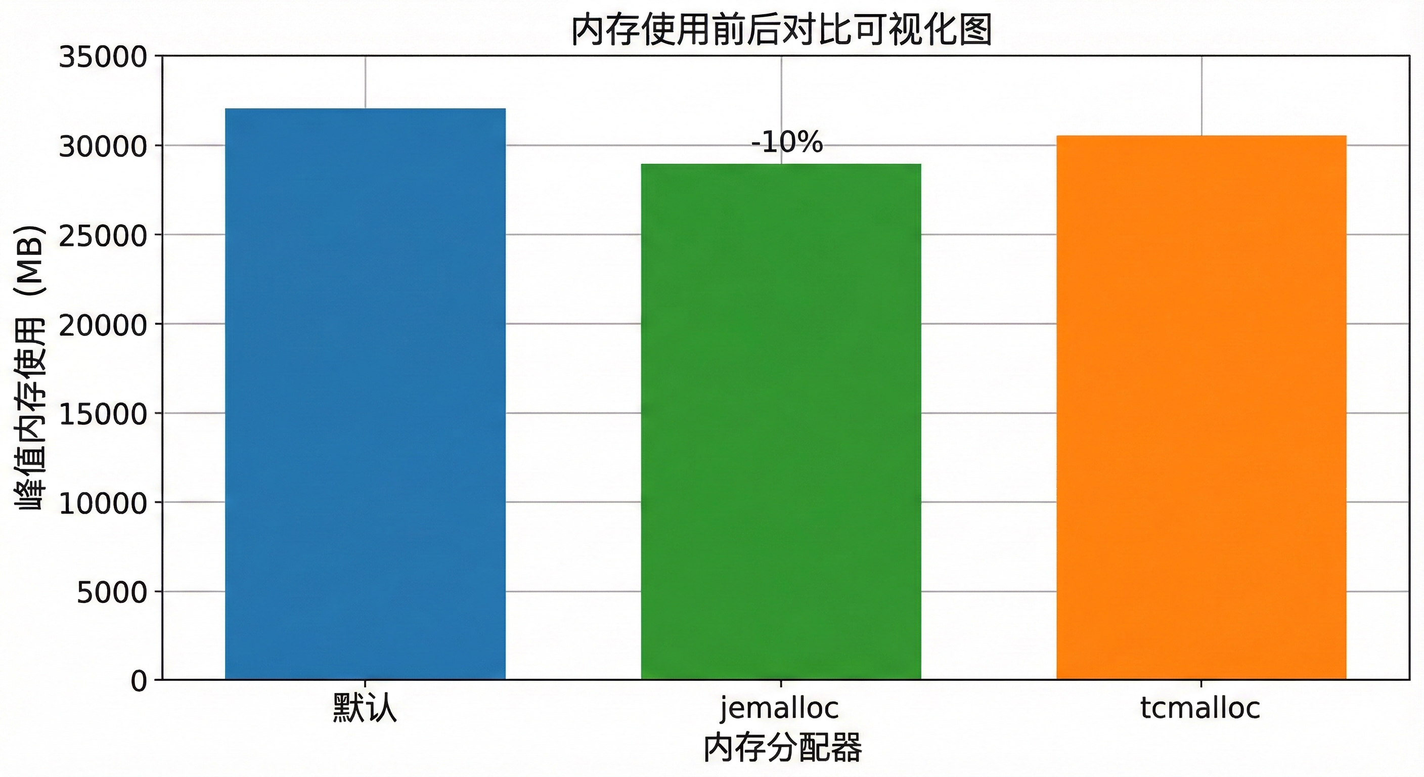 这个柱状图显示了默认、jemalloc和tcmalloc下的峰值内存,jemalloc胜出。