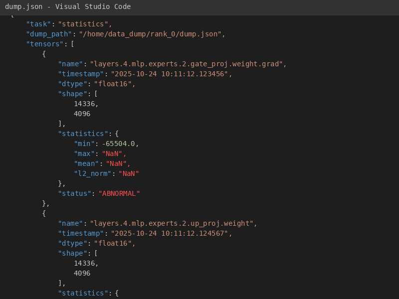 日志截图(dump.json 片段)如下,显示min/max值异常。