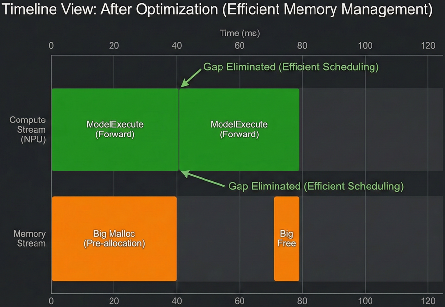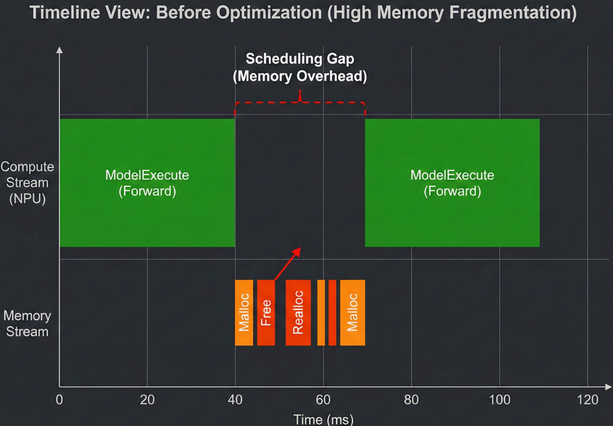 下图展示了优化前的Profiling时间轴(红色箭头指向处展示了明显的调度间隙(Gap),表明NPU在等待CPU进行内存调度,并未满负荷工作)。可以看到在两个ModelExecute(模型计算)块之间,存在较长的空白间隙(Gap)。通过查看详情,发现这些间隙主要消耗在内存申请和释放的操作上,并没有在这个时间段内高效利用NPU计算单元。