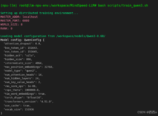 # 设置环境变量export MASTER_ADDR=localhostexport MASTER_PORT=6000export NNODES=1export NODE_RANK=0# 启动训练bash scripts/train_qwen3.sh