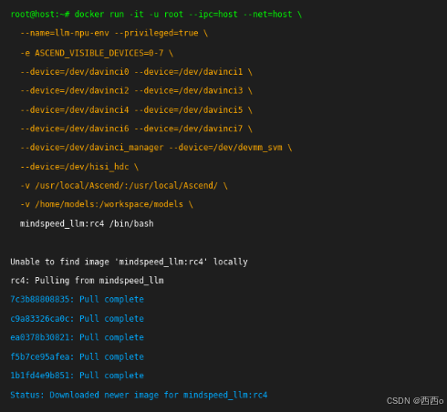 # 启动NPU容器的完整命令docker run -it -u root --ipc=host --net=host \--name=llm-npu-env \--privileged=true \-e ASCEND_VISIBLE_DEVICES=0-7 \--device=/dev/davinci0 \--device=/dev/davinci1 \--device=/dev/davinci2 \--device=/dev/davinci3 \--device=/dev/davinci4 \--device=/dev/davinci5 \--device=/dev/davinci6 \--device=/dev/davinci7 \--device=/dev/davinci_manager \--device=/dev/devmm_svm \--device=/dev/hisi_hdc \-v /usr/local/Ascend/:/usr/local/Ascend/ \-v /home/models:/workspace/models \mindspeed_llm:rc4 /bin/bash