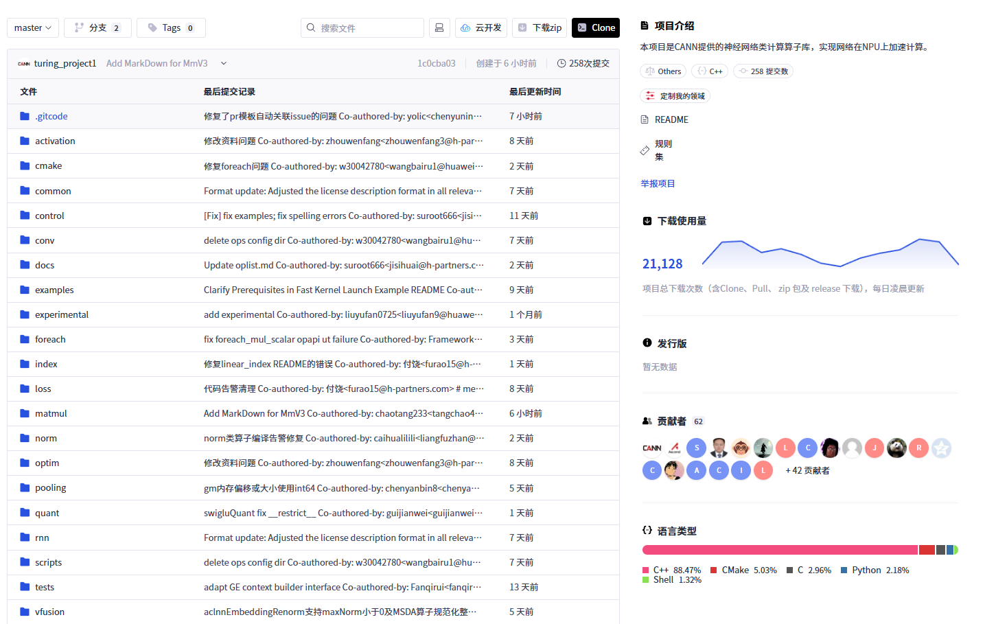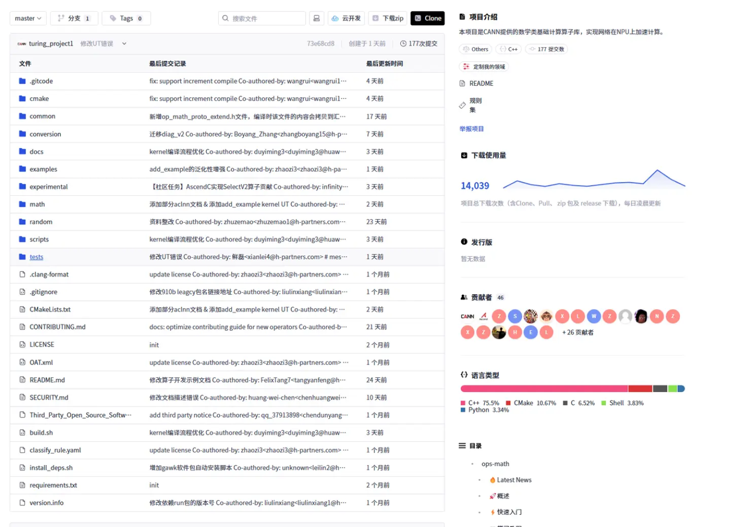 访问 https://gitcode.com/CANN 可以看到,CANN 并非单一仓库,而是由 多个子项目(Repositories)组成的组织级开源体系。截至到今天,这个组织下包含 27 个公开项目,涵盖基础库、工具链、示例代码、文档、测试框架等多个维度。