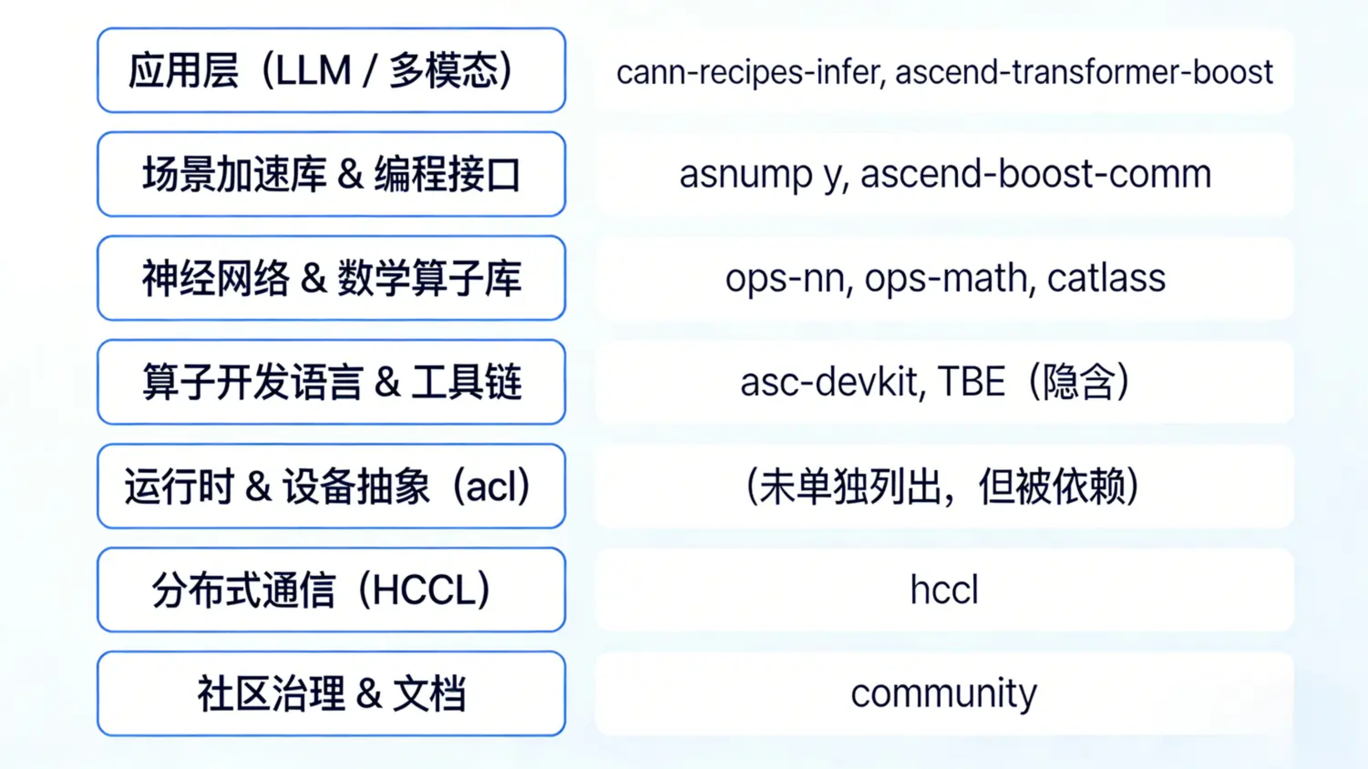 这两者构成了 CANN 的 算子基石,类似于 cuBLAS + cuDNN 在 CUDA 生态中的地位。