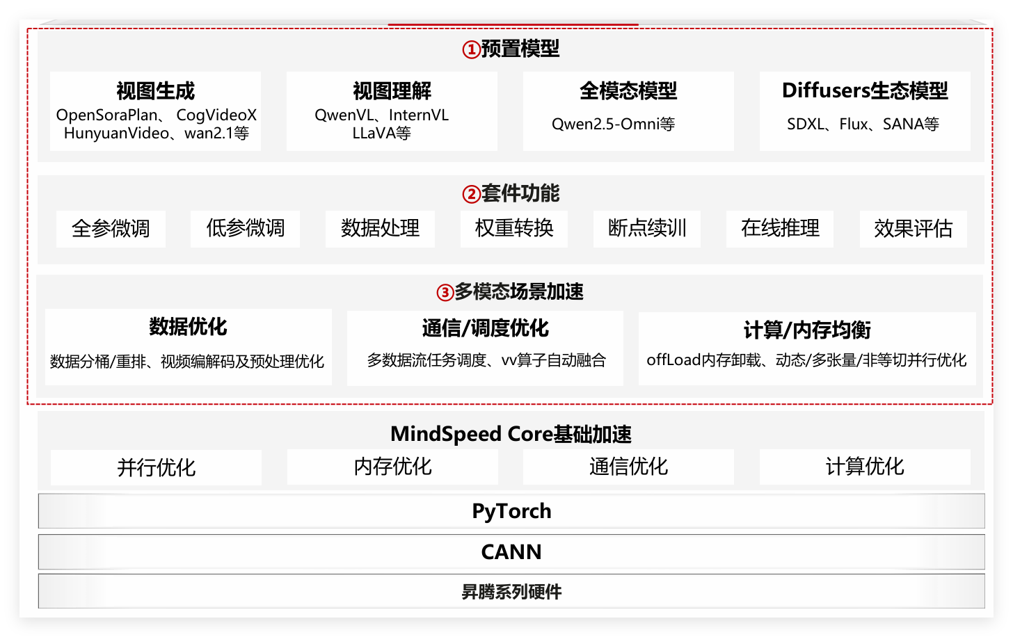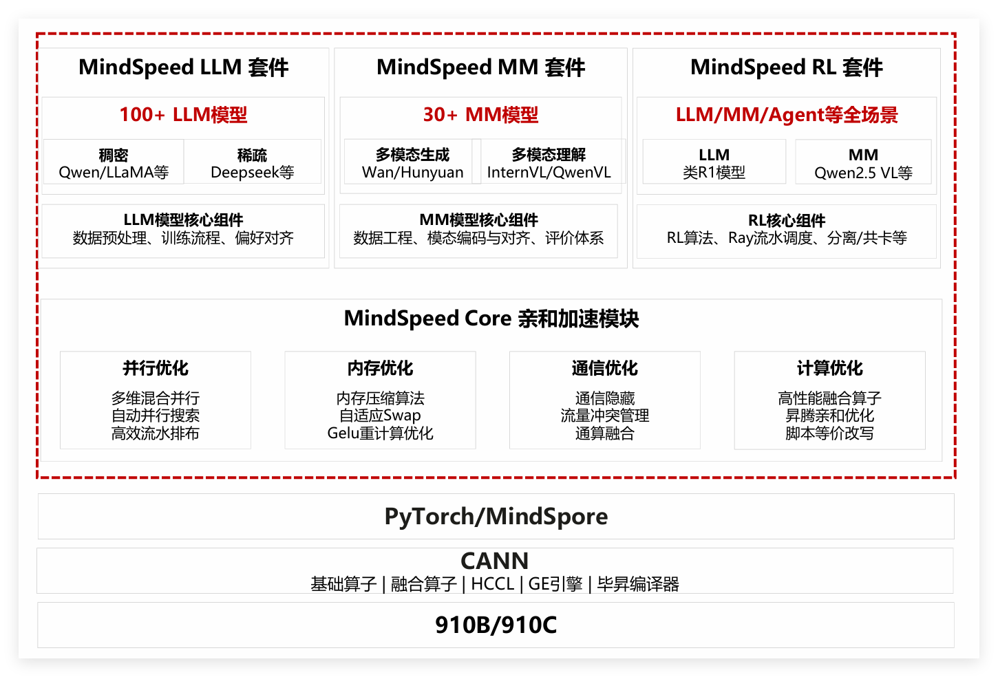 - 底层基础层:基于昇腾芯片,整合 CANN、HCCL、毕昇编译器,支持 PyTorch/MindSpore,实现模型与硬件高效适配,无需手动调参。