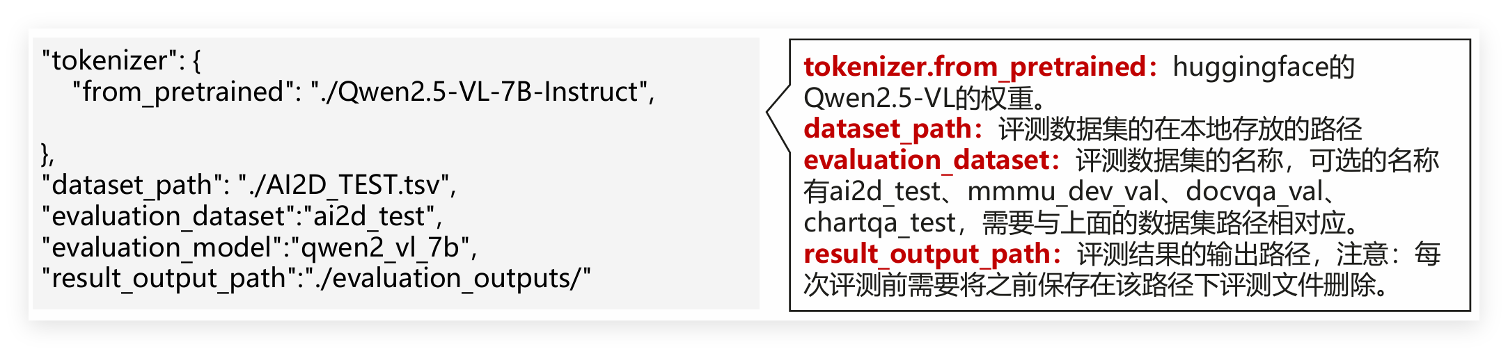 然后修改examples/qwen2.5vl/evaluate_qwen2_5_vl_7b.json,重点配置这几个参数,别写错路径: