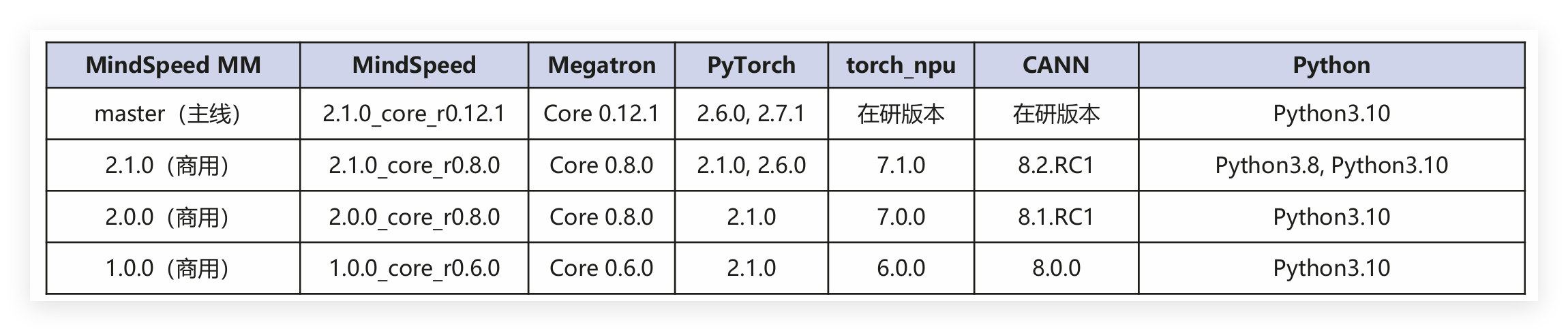 环境配置最关键的就是版本匹配,MindSpeed MM支持Atlas 800T A2等昇腾训练硬件形态,软件版本配套表如下