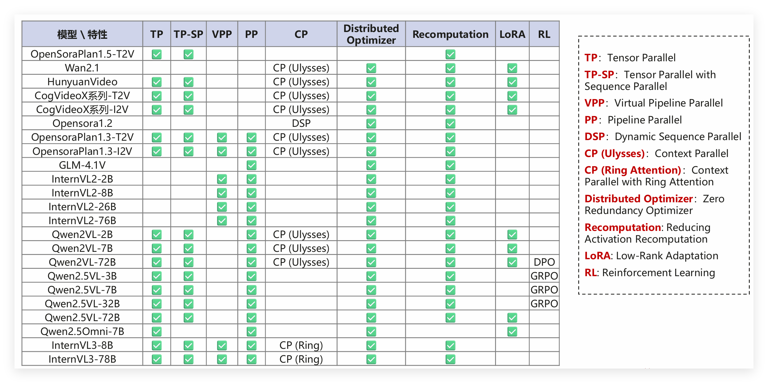 这里解释下几个关键术语,避免新手踩坑:TP(Tensor Parallel)是张量并行,CP(Context Parallel)是上下文并行,DSP(Dynamic Sequence Parallel)是动态序列并行,LoRA(Low-Rank Adaptation)是低秩适配,适合小数据集微调,RL(Reinforcement Learning)是强化学习,多用于模型效果迭代。