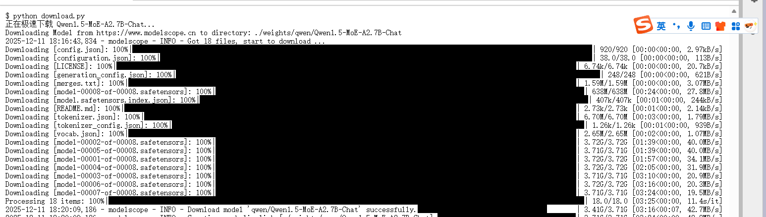 print("正在极速下载 Qwen1.5-MoE-A2.7B-Chat...")