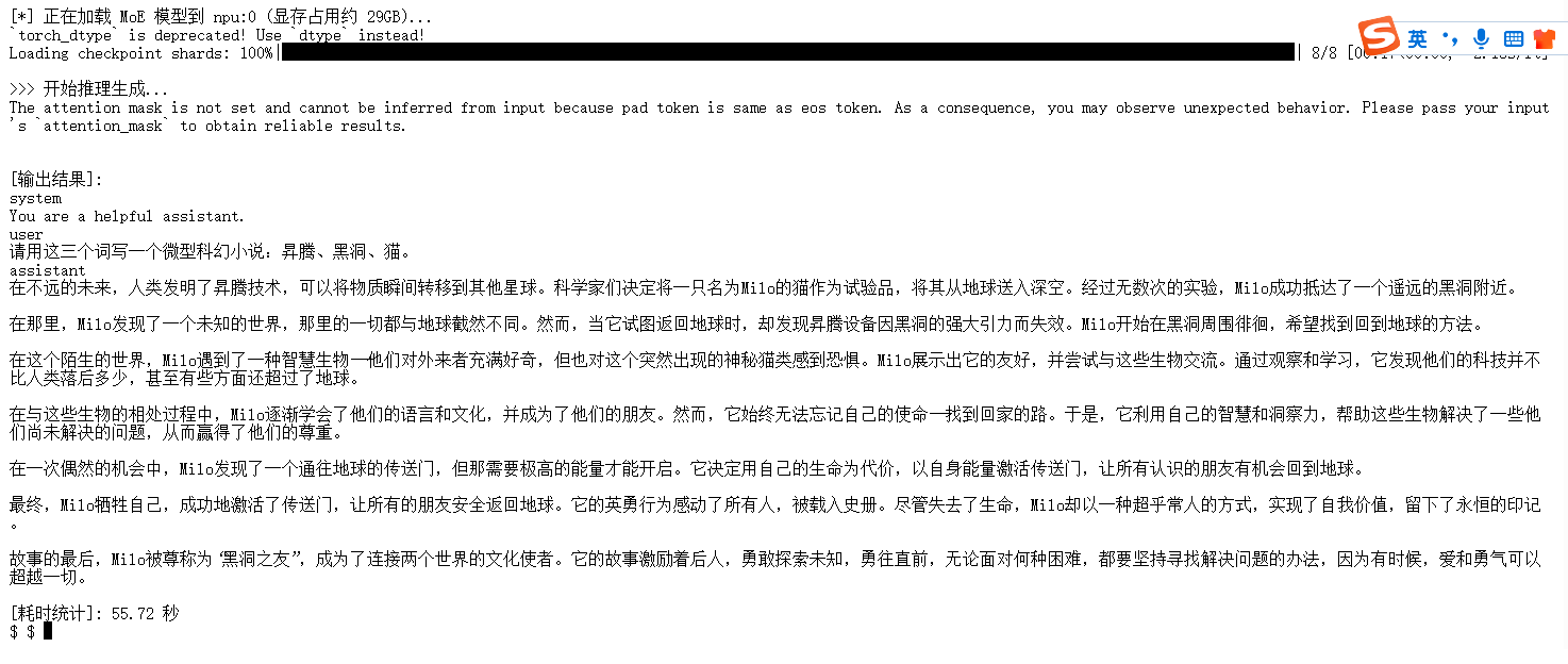 如下图所示,我自己使用 Prompt “请用这三个词写一个微型科幻小说:昇腾、黑洞、猫”进行了基础推理测试。 模型成功识别了意图,并生成了逻辑通顺、情节完整的微型小说。从日志中可以看到,在首次加载模型权重(约 29GB)并完成推理的全过程中,耗时控制在合理范围内。这证明了 PyTorch 算子在 NPU 上被正确编译和执行,模型的语义理解与生成能力在硬件上得到了完整保留。