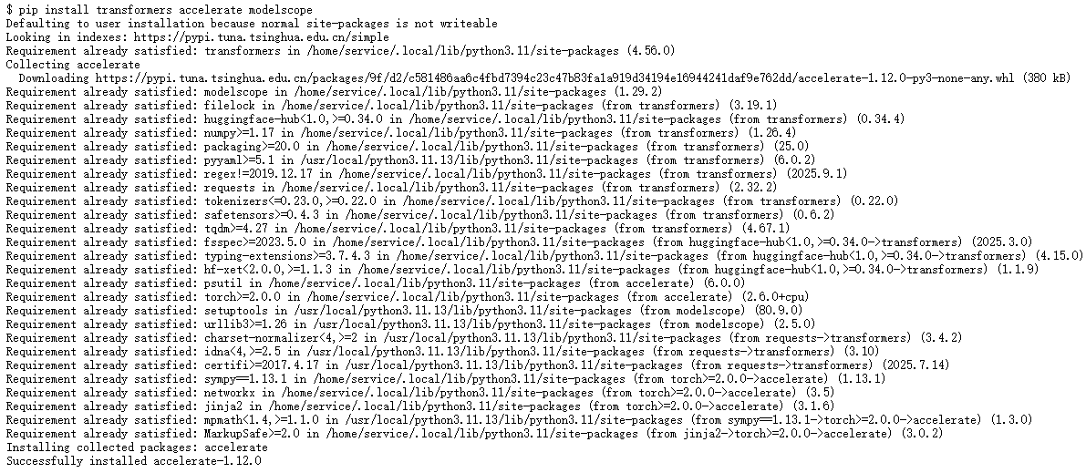 昇腾环境对 PyTorch 生态的支持已经非常成熟。我们需要安装 transformers、accelerate 以及魔搭社区的 modelscope SDK。