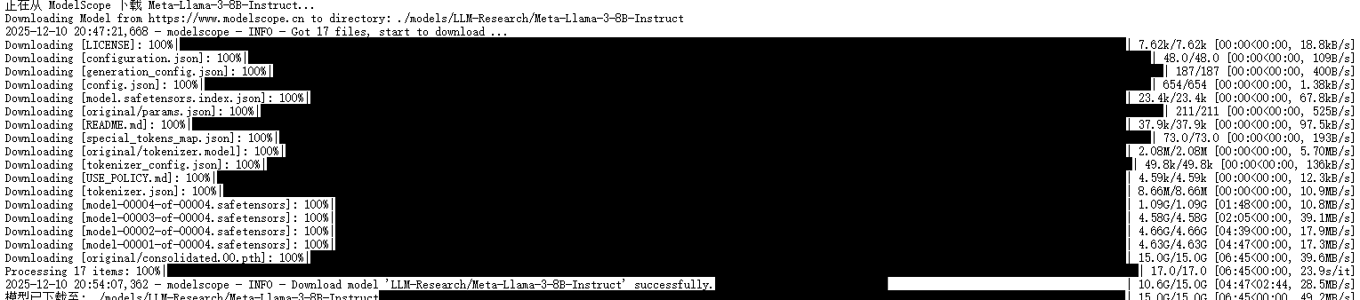 为了获得更稳定的下载体验,我们编写脚本从 ModelScope 社区下载 Meta-Llama-3-8B-Instruct 权重。