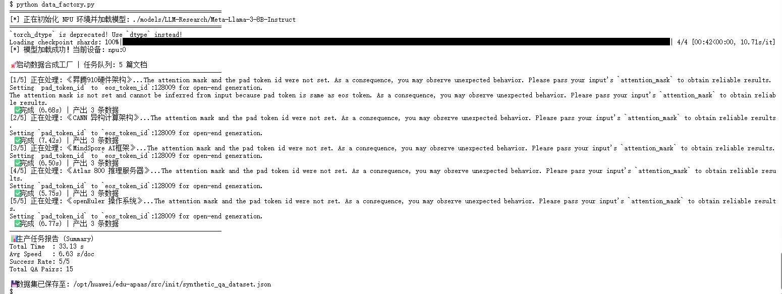 这一步是之后操作的基础。需要激活昇腾 NPU 环境,并解决 Llama-3 在 Tokenizer 上的一些兼容性小问题(如缺少的 Pad Token)。