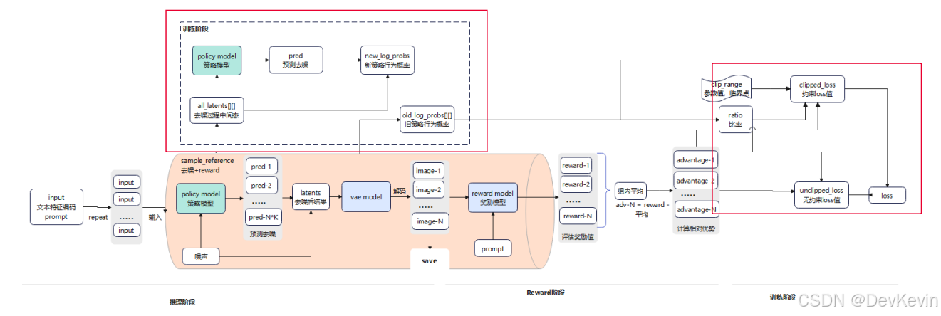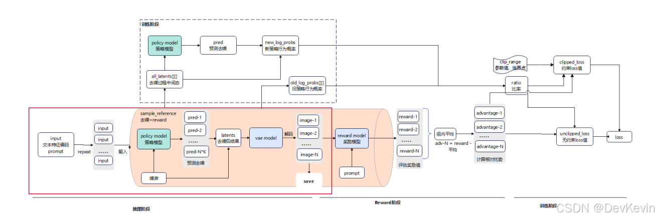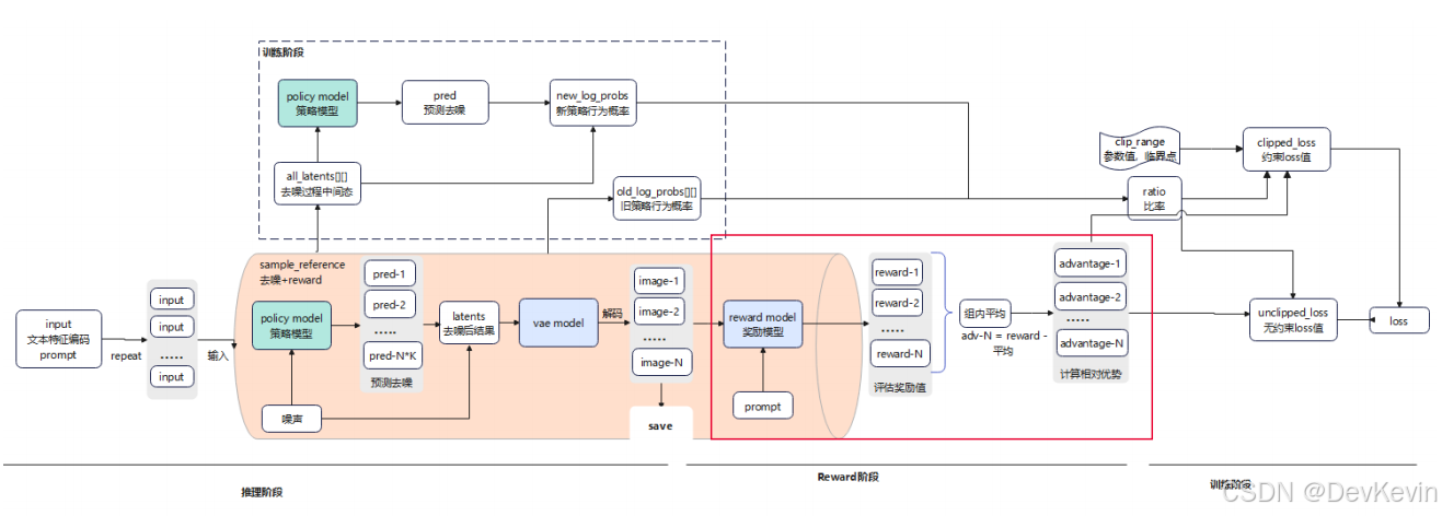 它的核心思路其实挺直观的:对同一个文本提示词,让模型生成一组图像(默认12张),然后用reward模型给这些图像打分,接着通过强化学习让模型学会生成高分图像的策略。听起来简单,但实现起来涉及三个关键阶段: