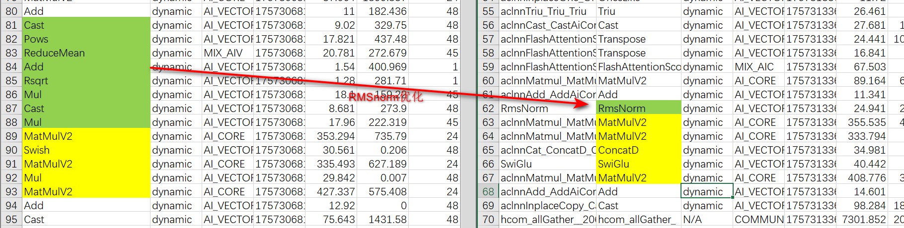 图13截图显示:左侧为原始RMSNorm算子(8个小算子串联,耗时95us),右侧为融合算子(1个大算子,耗时24.9us),绿色标注优化部分,验证模型层数增加时收益累积效应。 |