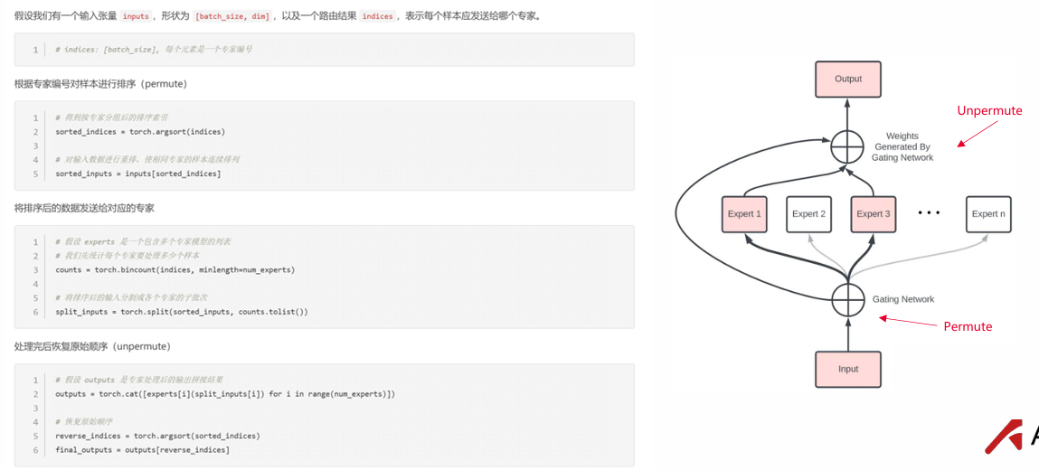Permute & Unpermute算子原理架构图包含重排(Permute)为高效并行计算聚集同一专家样本、反重排(Unpermute)恢复原始顺序的原理,附代码示例及架构图(数据输入经Gating Network重排至各Expert,输出再反重排)。 |