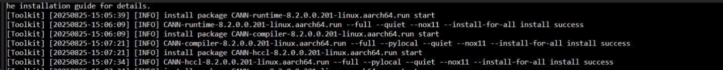 Plain Text# 步骤1:下载CANN工具包(社区版) wget https://ascend-repo.obs.cn-east-2.myhuaweicloud.com/Milan-ASL/Milan-ASL%20V100R001C20SPC002/Ascend-cann-toolkit_8.2.RC1_linux-aarch64.run # 步骤2:安装(需root权限) chmod +x Ascend-cann-toolkit_8.2.RC1_linux-aarch64.run ./Ascend-cann-toolkit_8.2.RC1_linux-aarch64.run --install --install-path=/usr/local/Ascend # 步骤3:设置环境变量(红字标出实际操作截图位置:**此处应插入`source /usr/local/Ascend/ascend-toolkit/set_env.sh`执行后终端提示界面**) echo "source /usr/local/Ascend/ascend-toolkit/set_env.sh" >> ~/.bashrc source ~/.bashrc # 验证安装:npu-smi info(查看NPU状态) |