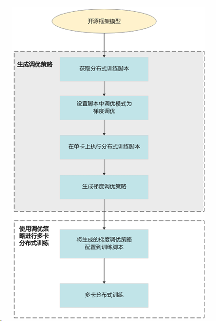 - GDAT梯度调优:流程如图7所示,分“生成调度策略”(获取分布式脚本、设置通信模式、单卡执行生成策略)和“多卡训练”(配置策略后执行)两步,缩短通信拖尾时间。