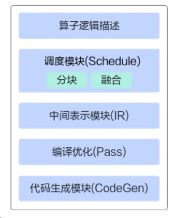 TBE功能框架图表展示算子逻辑描述的流程结构,从上至下依次为算子逻辑描述、调度模块(含分块和融合)、中间表示模块(IR)、编译优化(Pass)、代码生成模块(CodeGen)。 |