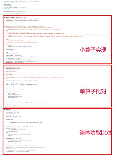 图片16展示:三张内容相似的代码截图,分别标注“小算子实现”(PyTorch原生逻辑)、“单算子比对”(融合算子与小算子结果比对)、“整体功能比对”(Permute+Unpermute后输出与输入一致性验证)。 |