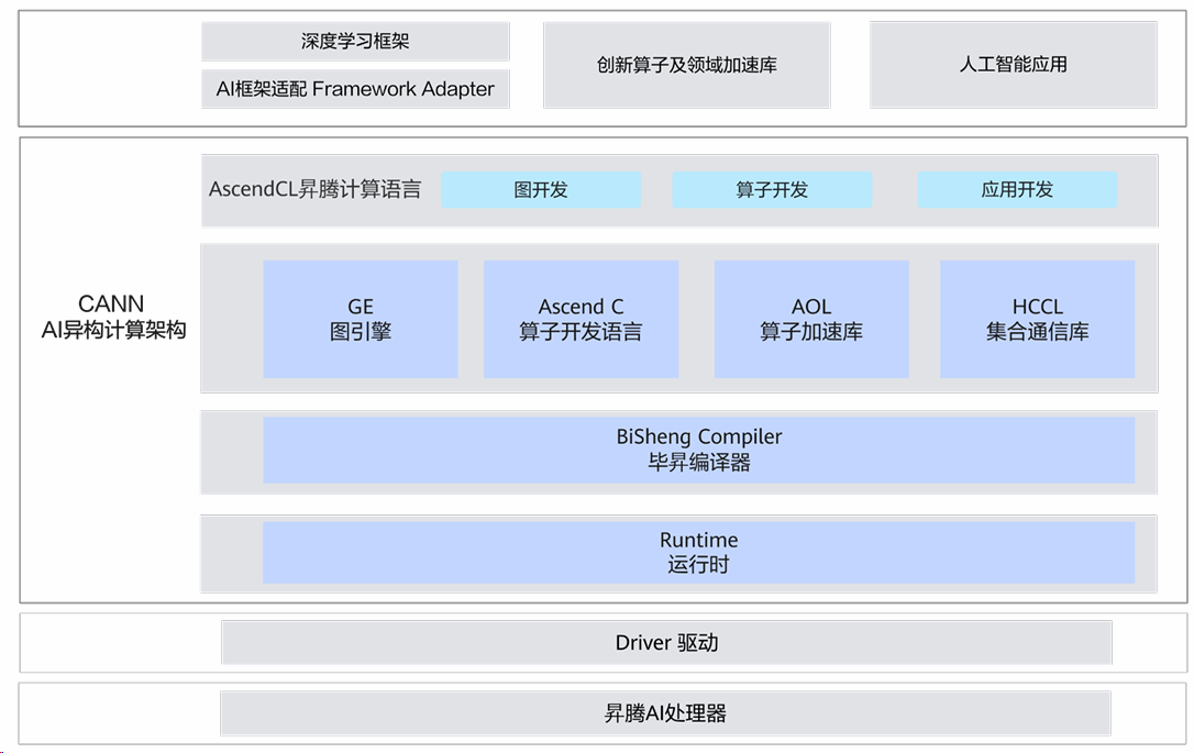 CANN AI架构计算架构图展示其分层结构:上层为深度学习框架适配、创新算子与库、AI应用;中间层含AscendCL编程语言及图开发、算子开发、应用开发模块,还有GE图引擎、Ascend C算子语言、AOL加速库、HCCL通信库,以及毕昇编译器、运行时;下层为驱动和昇腾AI处理器。 |