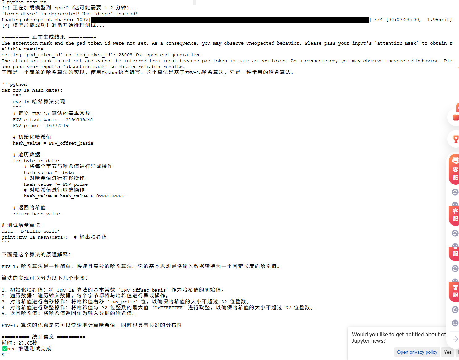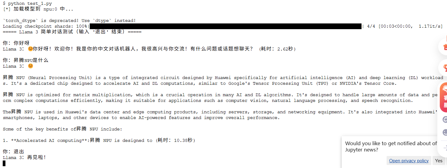 经过完整验证,Llama 3-8B 在 Atlas 800T Notebook 环境中可以顺利完成端到端部署。整体体验足够流畅,且不需要复杂的适配性修改。