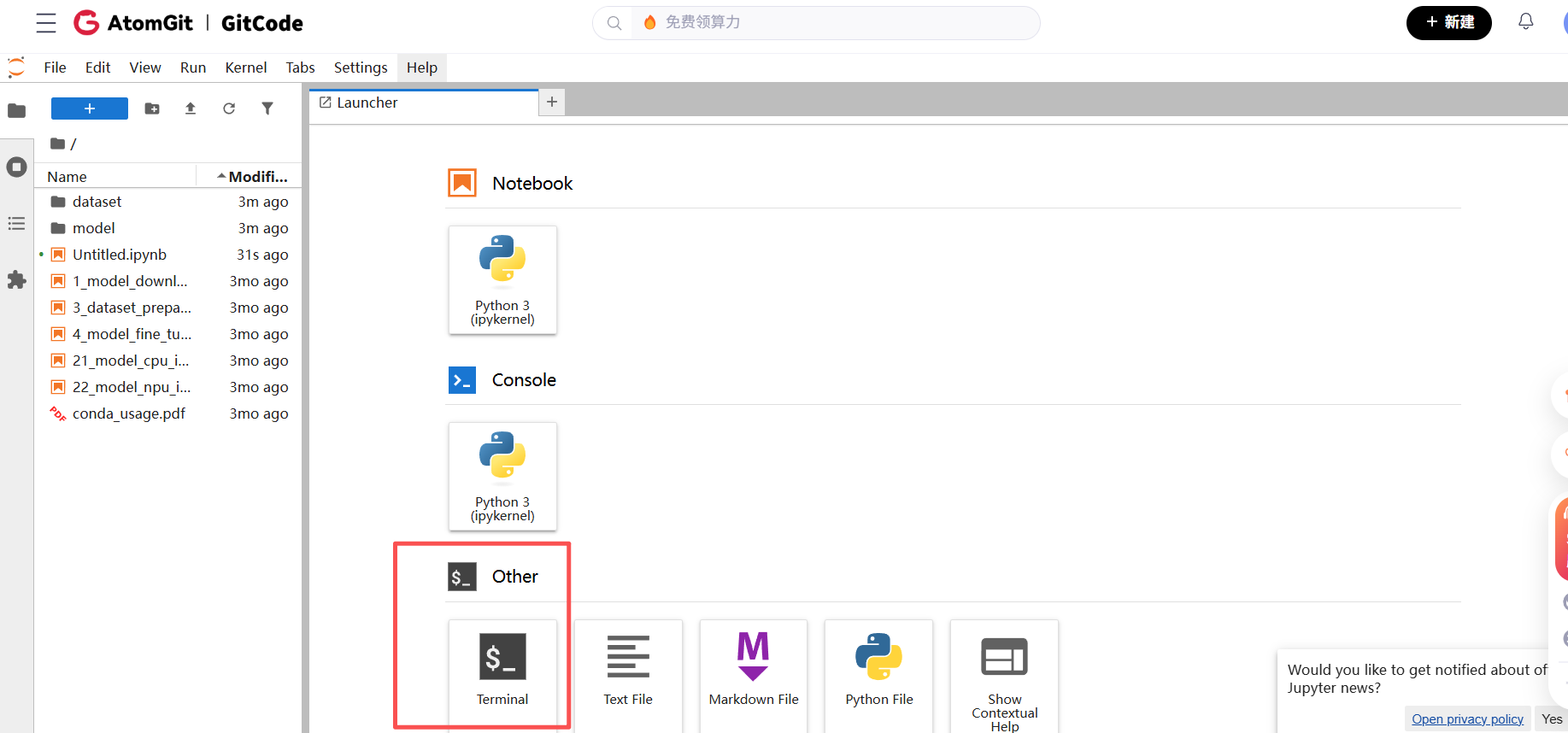 完成以上步骤后我们就已经进入NoteBook里面了,先别急着操作,我们打开终端输入指令来看看,进入 Notebook 之后,可以先在 Terminal 中执行: