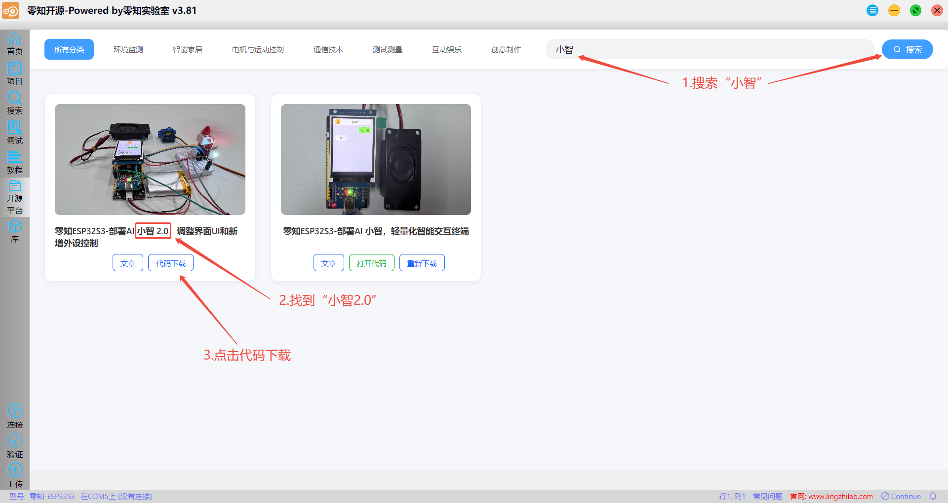 2.1 开源平台-输入 小智 并搜索-代码下载自动打开