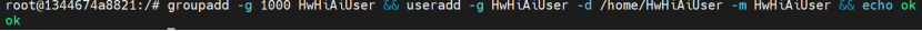 groupadd -g 1000 HwHiAiUser && useradd -g HwHiAiUser -d /home/HwHiAiUser -m HwHiAiUser && echo ok