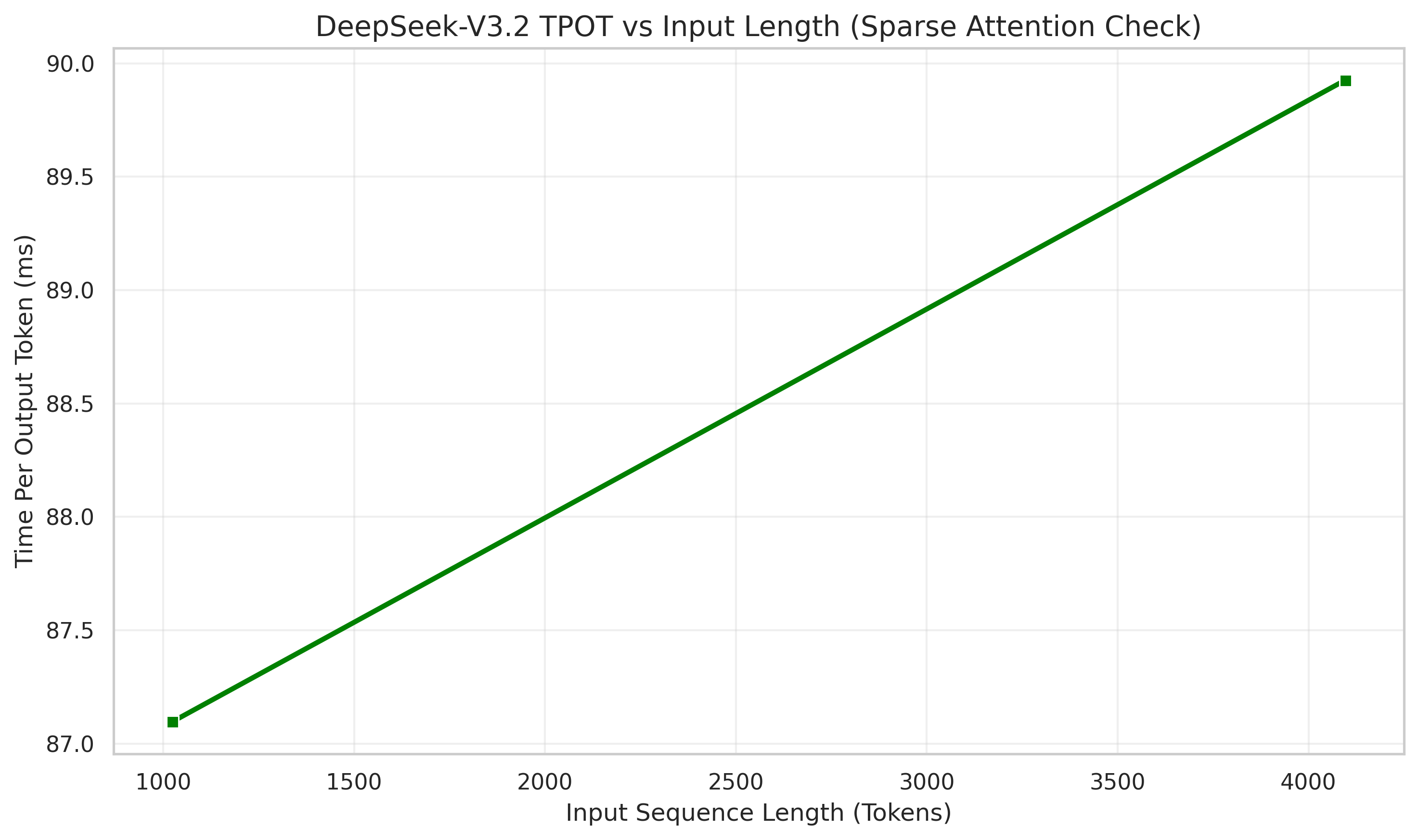 ○ 技术细节:Indexer Cache 采用动态 Per-token-head 8-bit 量化,极大稳定了长序列下的解码速度。这也是为什么在 TPOT 分析中,输入长度增加 4 倍,输出耗时仍维持在 90ms 左右的关键原因。