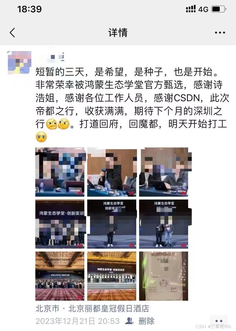 话题拉回2023年12月,当时鸿蒙技术还是内测版,需要定邀才能参与鸿蒙技术的体验和学习使用。笔者作为技术社区的头部博主,有幸被华为鸿蒙项目组遴选为HarmonyOS Next内测版的内训人员,和其他大厂以及社区推荐的技术博主一道,参与了为期4天的专项培训,我觉得这几天的实训对我个人来讲是有特殊意义的,这不仅是技术专项学习的机会,更是对我个人技术能力的拓展,以及帮我结实更多的志同道合的同行开发者,最重要的是开启了我参与鸿蒙生态的大门。