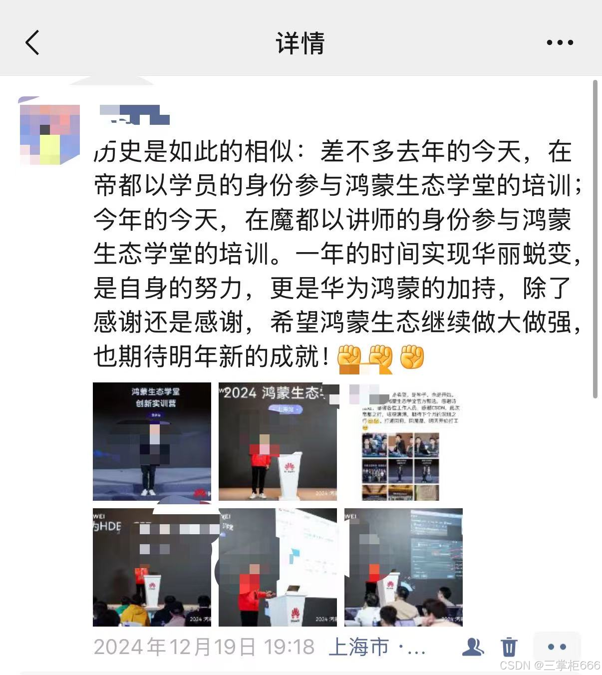 有意思的是,在2024年年底的时候,笔者有幸作为鸿蒙生态的分享嘉宾,参与了204鸿蒙生态学堂在上海站的实训,这是鸿蒙官方对我个人的认可和信任,我也是从一个鸿蒙学习使用者蜕变为专业的鸿蒙领域布道者,二者的跨度正好一年时间,非常有纪念意义。