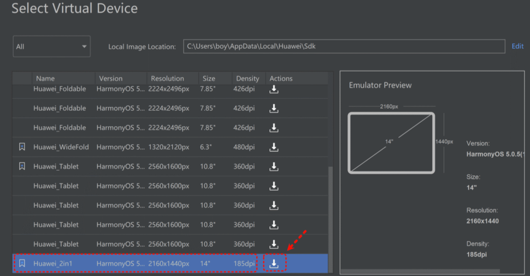 重要提示:模拟器镜像比较大,确保你的目标磁盘有足够的空间。我专门在D盘创建了一个HarmonyOS_Emulators文件夹来存放这些镜像。